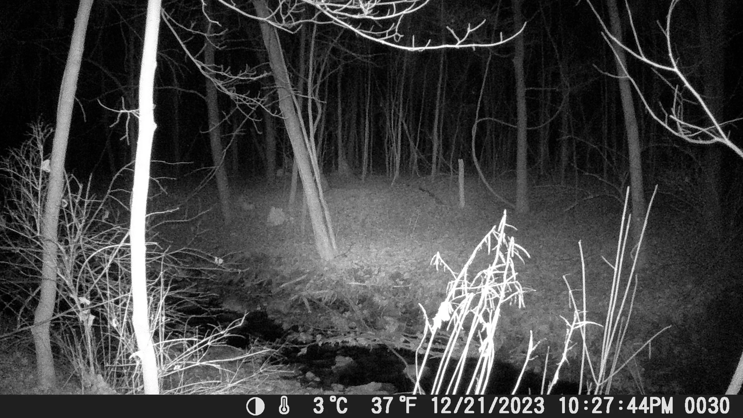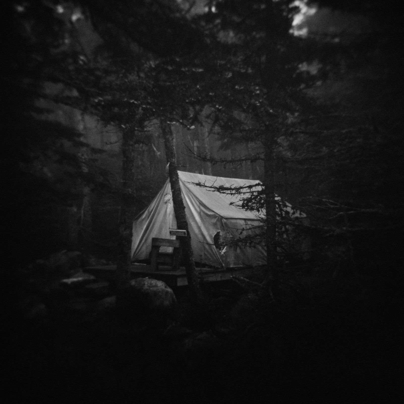 January in Vermont, wood, paint, extension cords, archival pigment prints, bioelectricity music, wooden chair, wool blanket, clamp lights, LED bulbs, balsam fir incense, 2023