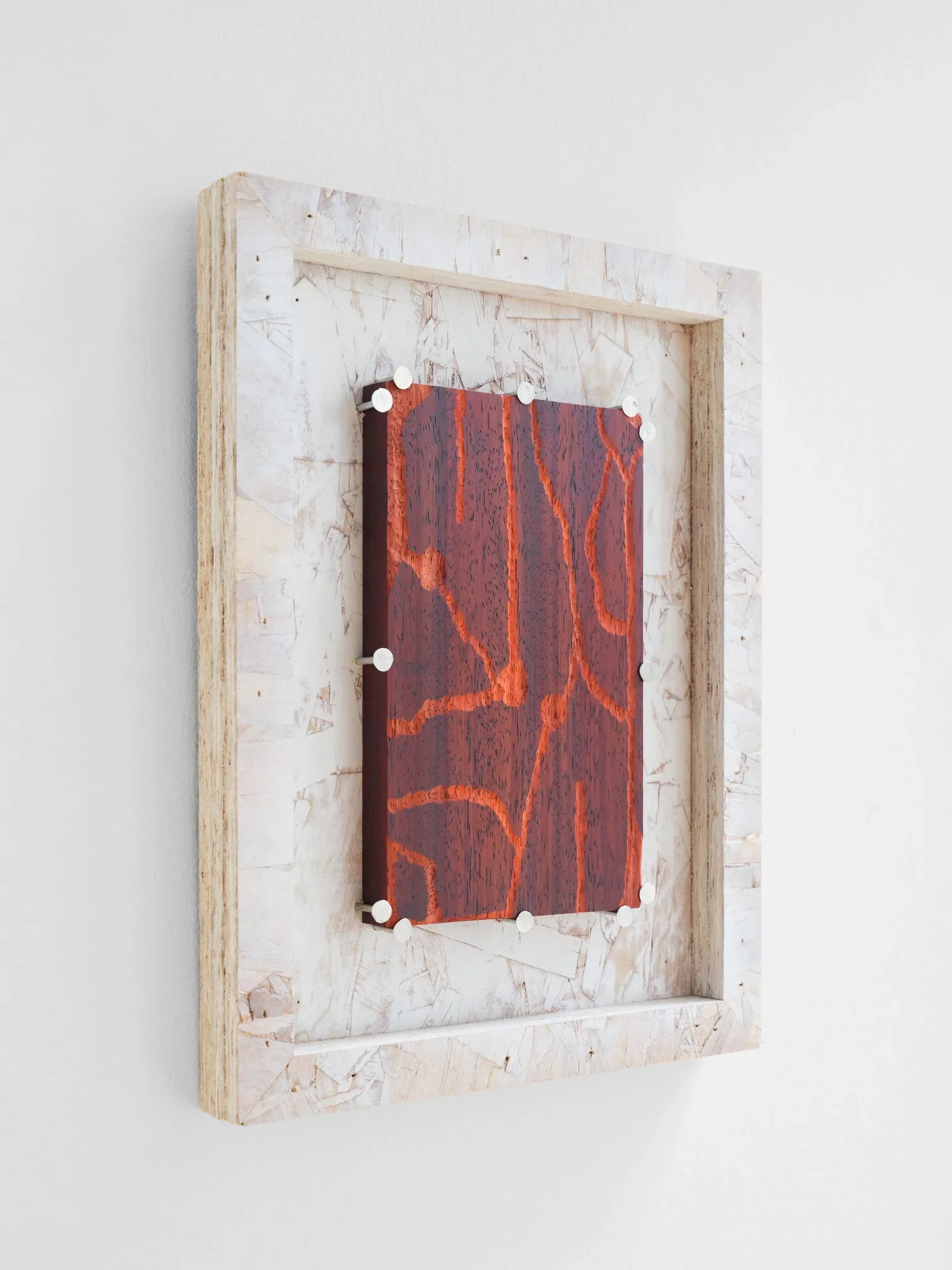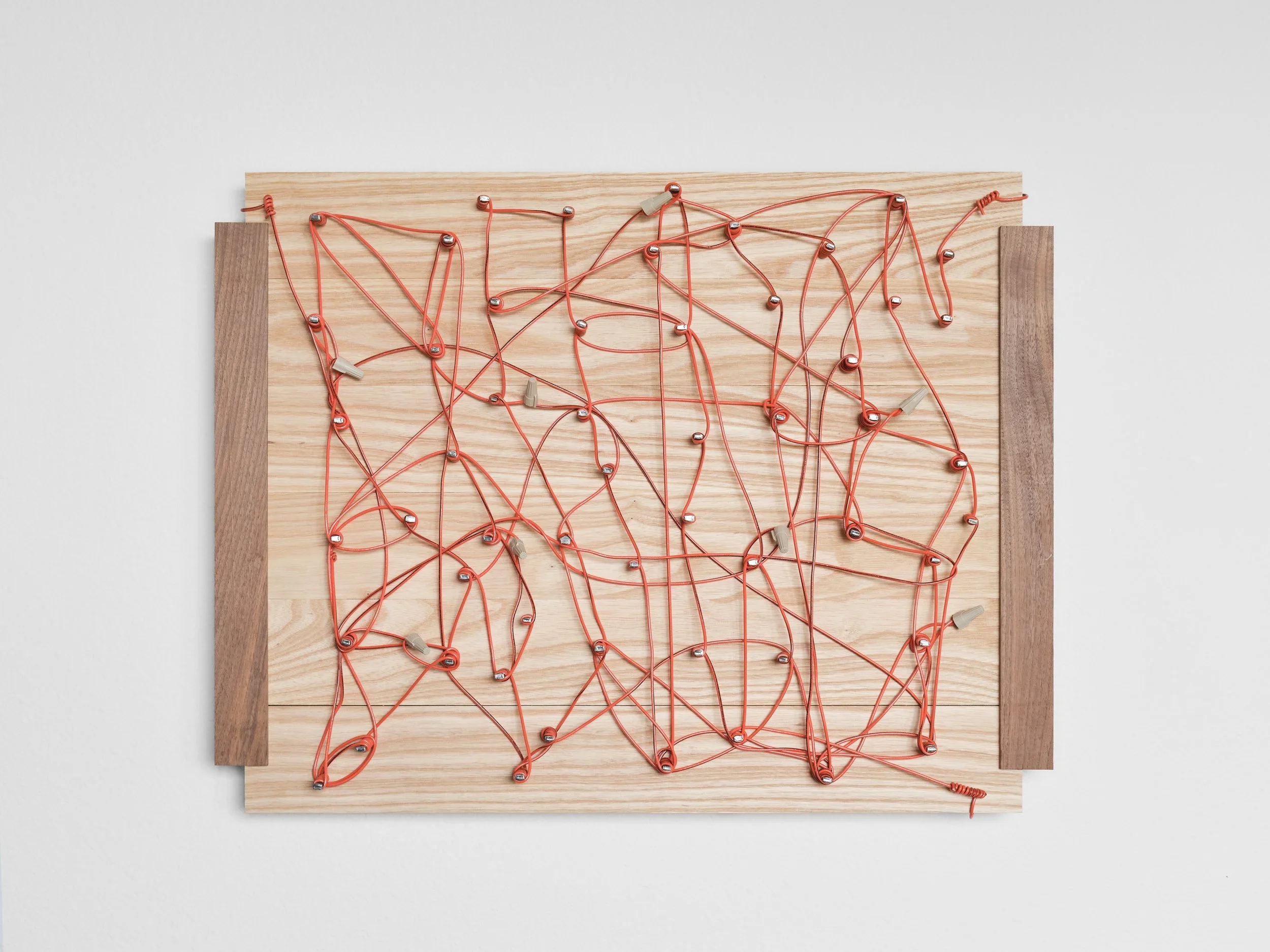 Grain Map, OSB, Paduak, roofing nails, spray paint, wood stain, 11 x 14 inches, 2025
