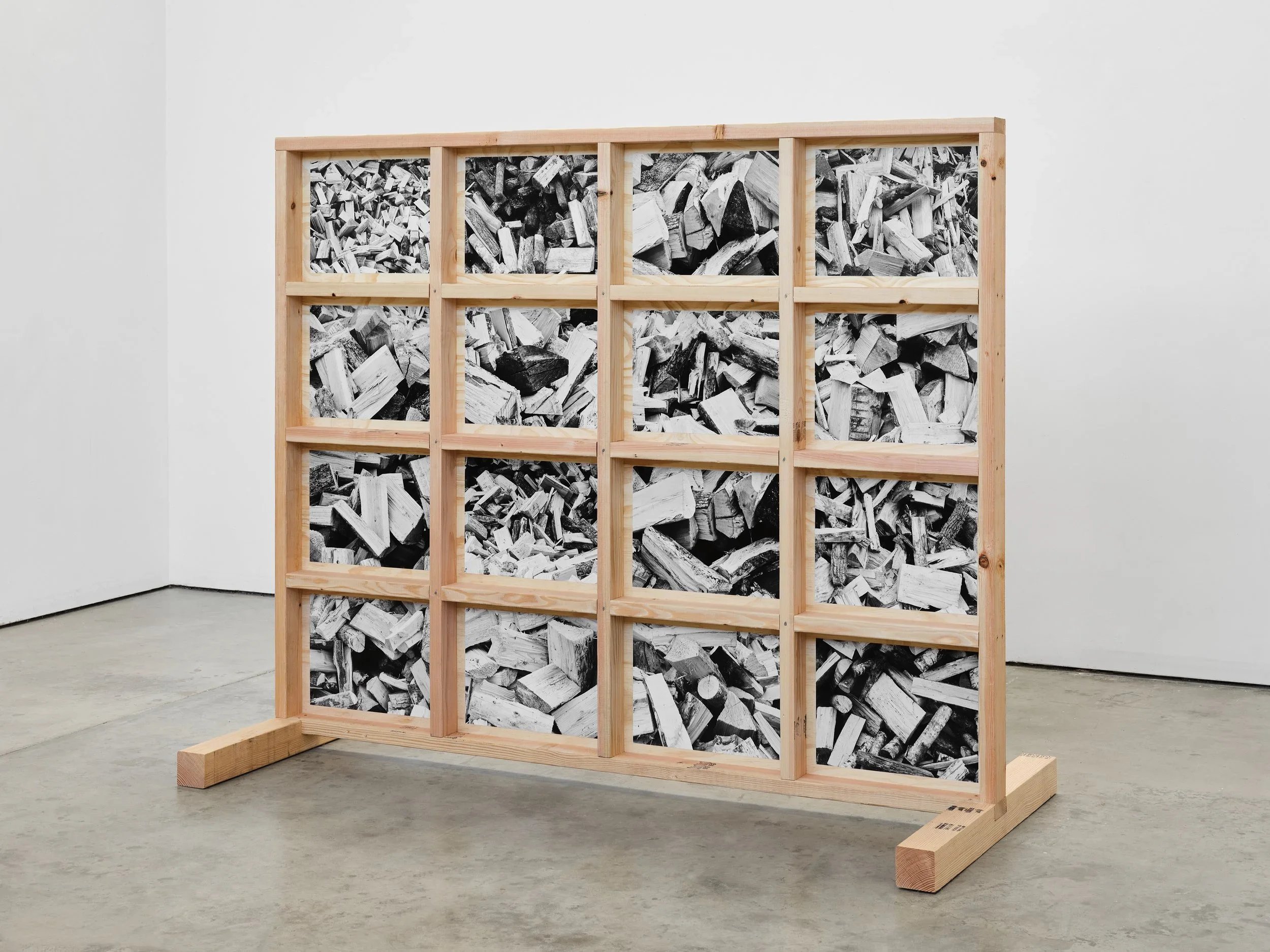 Firewood, wood, screws, steel cut nails, archival pigment prints, 80 x 66 x 36 inches, 2023